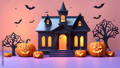 A house with a spooky Halloween theme is lit up with orange pumpkins and bats