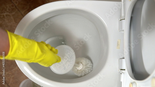 A housewife in rubber gloves cleans the toilet bowl with a special cleaner and a brush