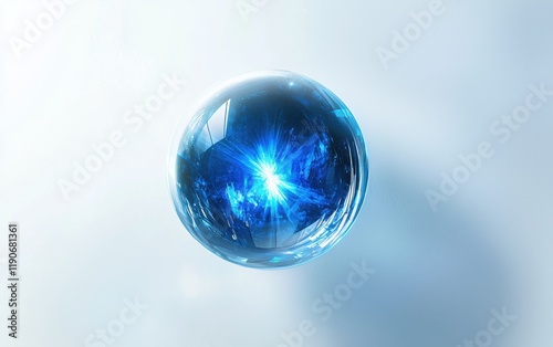 A hovering sapphire radiating deep blue light, spinning slightly on a bright white background