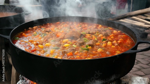 A Huge Pot of Soup Cooking Over an Outside Wood Fire Perfect for Outdoor Gatherings and Culinary Events