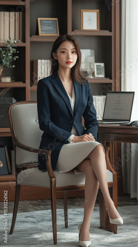 A hyper-realistic, professional photograph of a 25-year-old Asian female lawyer seated confidently in a modern office.
