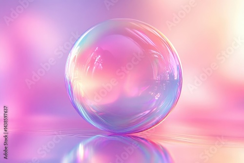 A iridescent soap bubble rests on a pastel pink surface, reflecting its vibrant colors.