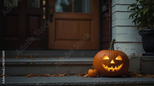 halloween, pumpkin, porch, door, front door, autumn, fall, leaf, orange, candle, light, holiday, skittish, scarey, festive, tradition, celebration, october, season, night, dark, home, house, step, decor, decoration, carving, happy, smile, grin, glowing, creepy, fun, trick, treat, ghost, monster, sorcerer, costume, party, event, front, yard, entranceway, front yard