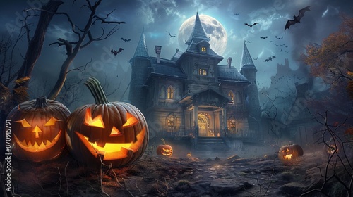 A jack-o-lantern with an evil grin against the backdrop of a creepy old haunted mansion with glowing windows. Full moon in the sky and bats flying in the night sky
