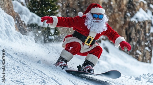 santa, christmas, snowboarding, holiday, winter, festive, joy, happiness, present, gift, snowy, mountain, hill, fun, recreation, leisure, activity
