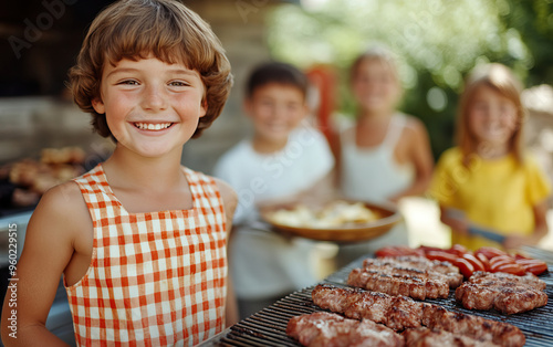 A joyful child grilling tasty burgers at a summer barbecue, surrounded by friends enjoying a fun outdoor gathering filled with laughter.