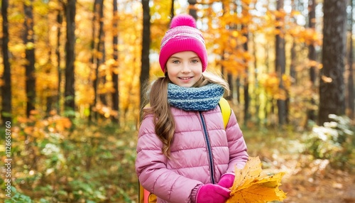 A joyful child playing in a vibrant autumn forest, surrounded by colorful leaves and the warm glow of the sun, capturing the essence of childhood wonder and the beauty of nature in fall.