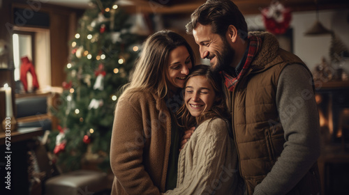 A joyful family share a warm embrace, laughing and smiling against a backdrop of a twinkling Christmas tree.