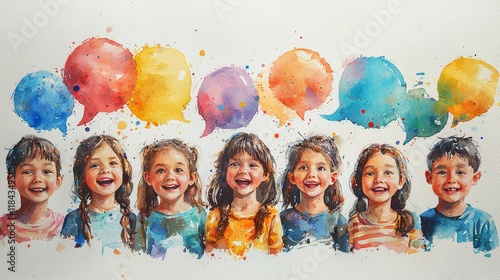 A Joyful Group of Children Smiling and Engaging with Colorful Speech Bubbles in a Whimsical Watercolor Style Illustration Representing Communication and Friendship