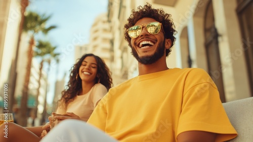friends, fun, outdoors, smiling, sunny, joyful, multiracial, togetherness, happiness, casual attire, bright, daylight, warm, city landscape, relaxed, laughter, young adult, urban, carefree, leisure, modern style, colourful, goggles, architecture, building, sunglasses, golden hour, palm tree, weekend, sunlight, vibrant, summer, friendship, urban life, composure, contentment, goodtime, relaxation, fashion