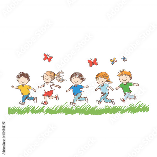 A joyful illustration of five children running playfully with butterflies around them, set against a white background, capturing the essence of childhood and freedom.