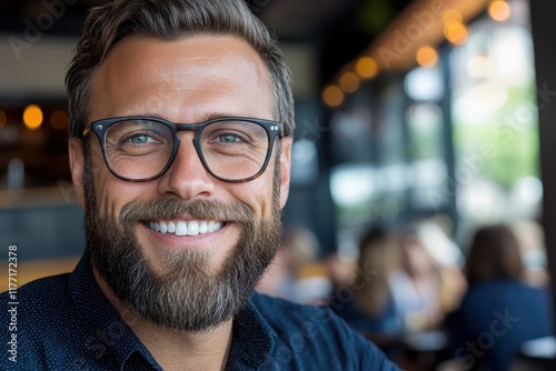 A joyful man with a stylish beard and glasses smiles warmly in a modern café, showcasing a friendly and inviting atmosphere in the background.