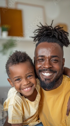 A joyful moment captured between a father and his son both smiling broadly with the father's dreadlocks adding a unique touch to their shared happiness.