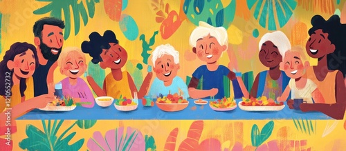 A joyful multi-generational family is depicted gathering for a meal at a long table with colorful backgrounds