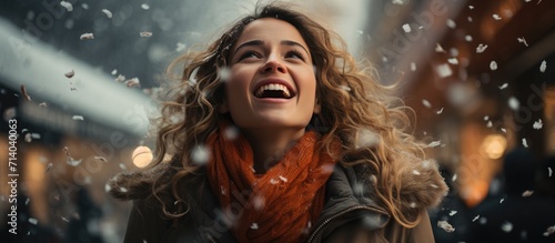 A joyful woman embraces the winter chill with her curly locks and vibrant orange scarf, radiating warmth and happiness through her contagious laughter