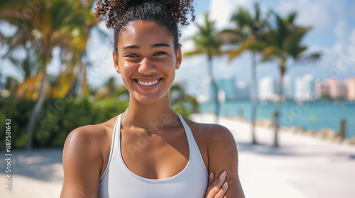 joyful, woman, smile, confidently, crossing, arm, miami, beach, promenade, fitness, attire, active, lifestyle, vibrant, summer, vibe, sun, water, setting, wellness, head shot, enthusiasm, spirit, training, exercise, energetic, healthy, coastal, vacation