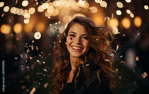 joyful, woman, curly, hair, smile, shimmer, light, confetti, festive, party, delight, laughter, sparkle, carefree, vibrant, upbeat, welcome, glistering, spirit, glamour, sunny, cheerful, special, gala, essence, gaiety, gleeful, night time, playful, beauty