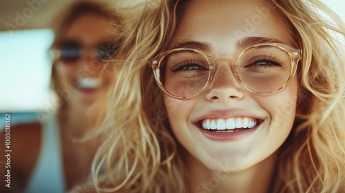 A joyful woman with wavy hair and clear glasses smiles in the foreground, exuding happiness and warmth, with a blurred figure enjoying the moment in the background.