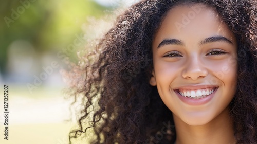 A joyful young girl with curly hair smiling brightly outdoors with a blurred green background : Generative AI