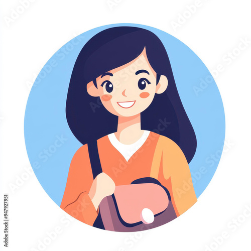 A joyful young woman with a bag, illustrated in a bold, colorful style, encapsulated within a minimal circle.