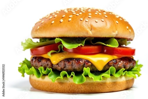 A juicy burger, isolated on white, with sesame seed bun, ketchup, restaurant, eat