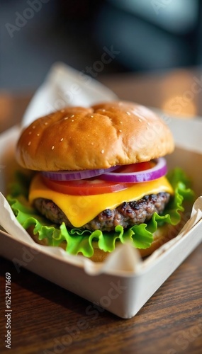 A juicy cheeseburger in a takeout container, ready to eat Fresh lettuce, tomato, onion, and melted cheese are visible Perfect for a quick and satisfying meal on the go , chips, eat, ketchup