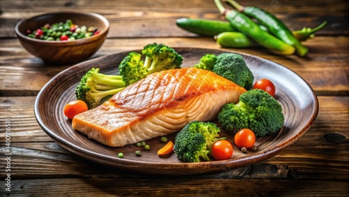 A juicy fried salmon steak sits atop a wooden table covered with steamed vegetables such as broccoli and carrots