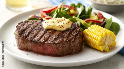 A juicy sirloin steak on a white plate, topped with a dollop of garlic butter and accompanied by a vibrant salad and grilled corn.