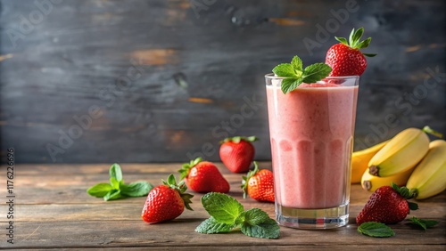 A juicy strawberry and banana smoothie in a tall glass, garnished with a sprig of fresh mint leaves and a few sliced strawberries on top , fruit, breakfast