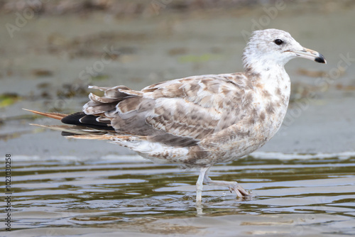 a juvenile seagull wades in the shore at Longbeach, Vancouver Island