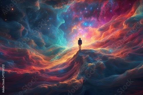 A kaleidoscopic cosmic wanderer, the psychedelic arcane nebula drifter, floats amidst a vast expanse of astral swirls and celestial colors.