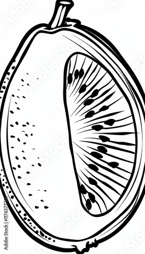 kiwi, fruit, slice, half, seed, food, illustration, drawing, line art, black-and-white, graphic, design, icon, logotype, symbol, healthy, diet, nourishment, vitamin, fresh, ripe, organic, natural, vegetarian, vegan, dessert, snack, juice, smoothie, salad, breakfast, lunch, dinner, meal, ingredient, produce, grocery, market, farm, agriculture, tropical, exotic, sweet, sour, lemony, juicy, delicious, tasty