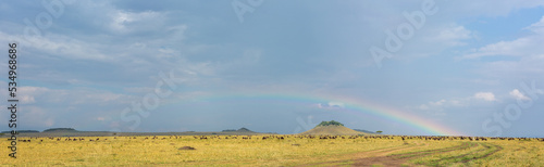 africa, kenya, mara, wild, savanna, barren, animal, wildlife, mammal, species, tail, nature, safari, beautiful, animal kingdom, vertebrate, mammalia, chordata, gnu, bovidae, gnu, antelope, beard, horned, abundant, migration, grass, hillock, landscape, rainbow, colourful, rain, panoramic, stitched