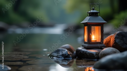 A lantern is placed carefully on some rocks that are submerged in the water