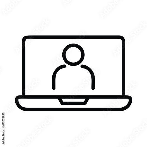 A laptop displays a stylized person icon likely representing online communication or a virtual meeting. Editable stroke icon. Vector illustration
