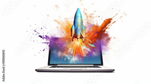 A laptop screen shows a rocket blasting off with a colorful explosion behind it
