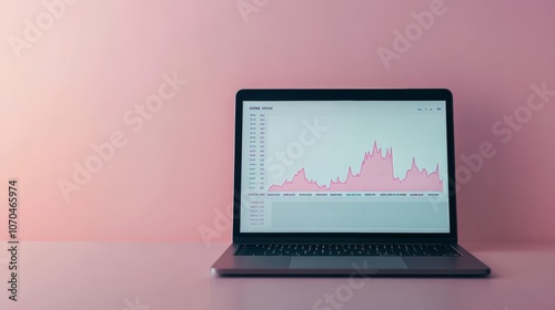 A laptop with a graph on the screen on a pink background.