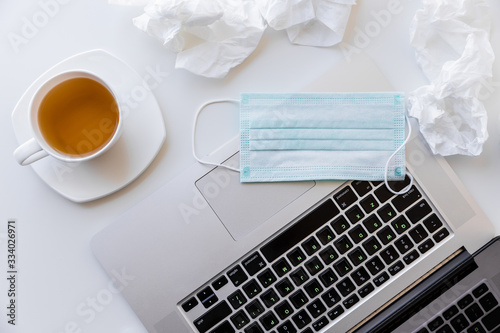 virus, health, saucer, mug, freelance, flu, risk, lifestyle, day, interior, background, indoor, drink, computer, keyboard, isolation, pandemic, epidemic, white, table, home, workplace, notebook, work, online, job, mask, medicals, napkin, used, tea, cup, quarantine, laptop