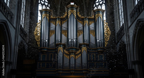 A large and ornate pipe organ inside a cathedral with gothic architecture