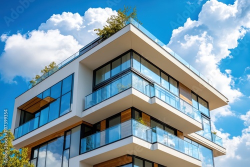 A large apartment building with many windows and balconies under a blue sky