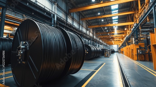 A large black industrial cable drum inside a factory warehouse. The drum holds heavy-duty electrical cables essential for power supply and other industrial purposes