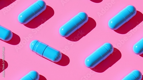 A large blue flat lay pill tablet on a pink background with a healthcare medication sign circle pale colour is rendered in 3D