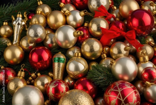 A large collection of multicolored Christmas baubles, decorated with a green ribbon at the top and red and gold ribbons underneath