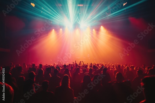 concert, music, live music, crowd, audience, stage, light, show, performance, event, festival, entertainment, party, nightlife, music festival, dj, gig, rave, club, indoor, venue, silhouette, people, energy, atmosphere, vibrant, colourful, red, orange, teal, darkness, spotlight, beam, backlighting, silhouette, shadow, exciting, fun