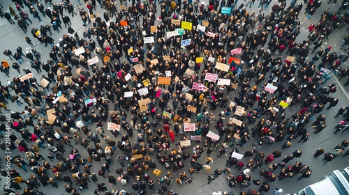 crowd, protest, signs, people, demonstration, march, gathering, banner, city, street, urban, public, political, social, movement, rally, participant, message, view, belief, right, freedom, equality, justice, change, reform, society, community, action, voice, expression, solidarity, oneness, together, human, issue
