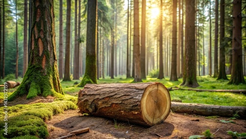 A large cut log with smooth ends and rough bark, sitting on a wooden stump in a forest clearing