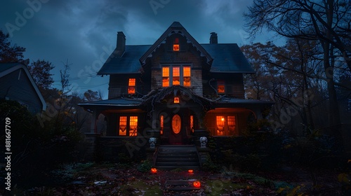 A large, dark, Victorian house stands illuminated by warm, orange light from windows and glowing jack-o'-lanterns