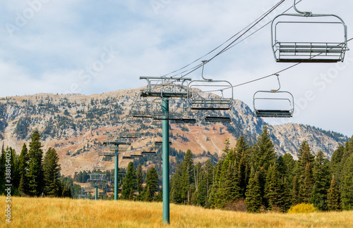 a large empty aerial chair lift at a closed ski resort in the Rocky Mountains of Montana with colorful autumn foliage