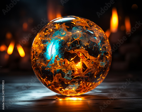 A large, glowing, orange and blue sphere sits on a wooden surface. The sphere is surrounded by a warm, glowing light that creates a sense of mystery and intrigue.
