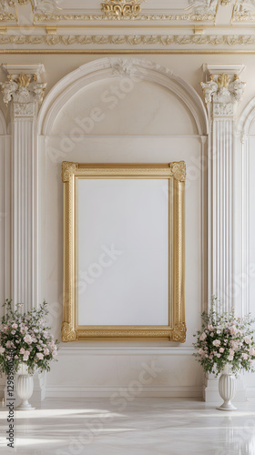 A large, gold photo frame is hanging on the wall of an elegant room with tall columns and arches